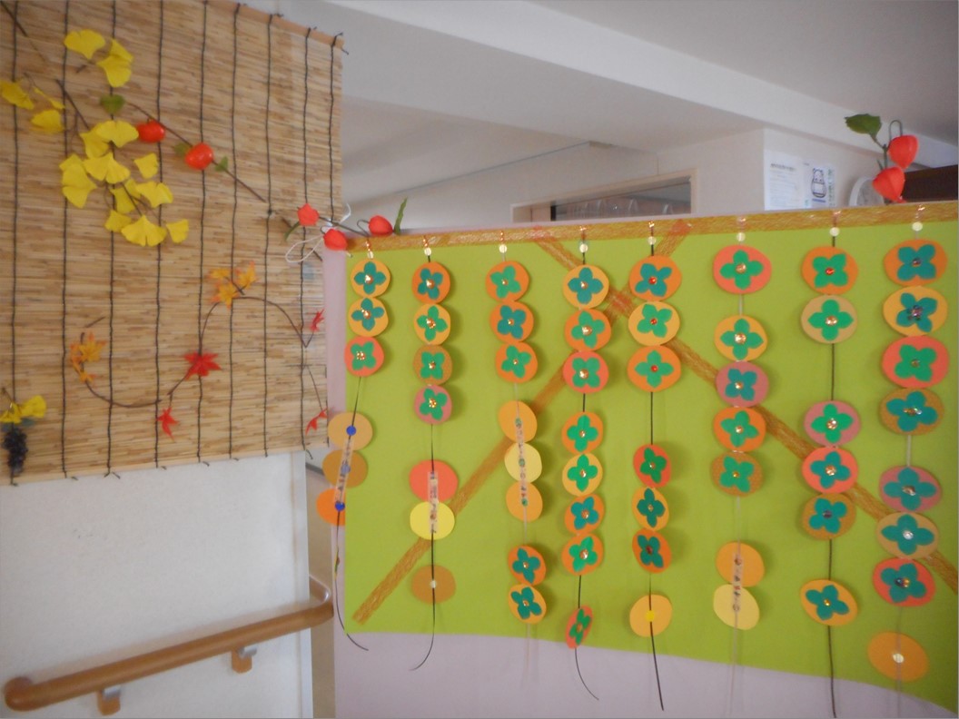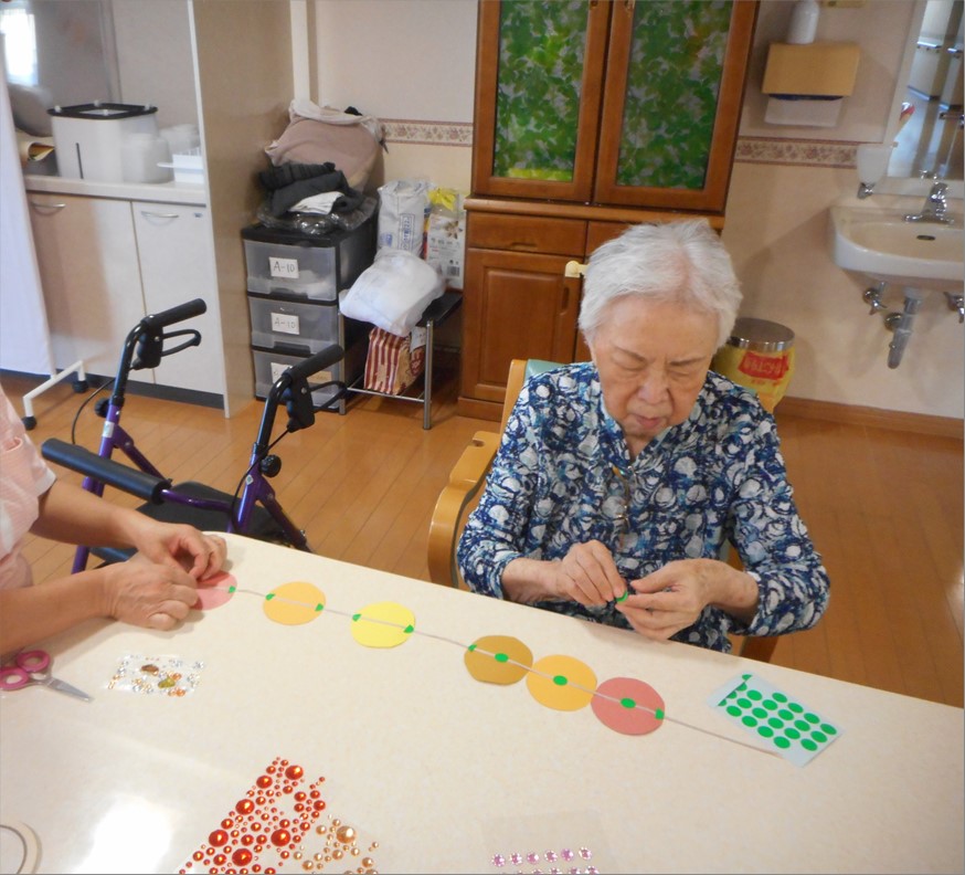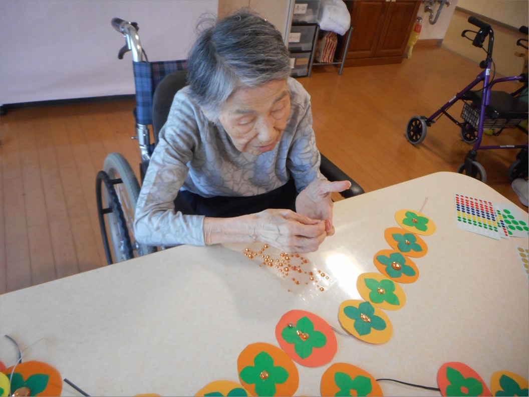 今回は、ご入居者様が美味しい干し柿作りに挑戦です!と、言っても本物ではなく、壁画の柿作りです♪