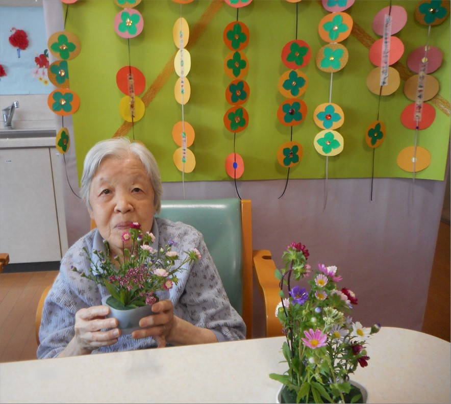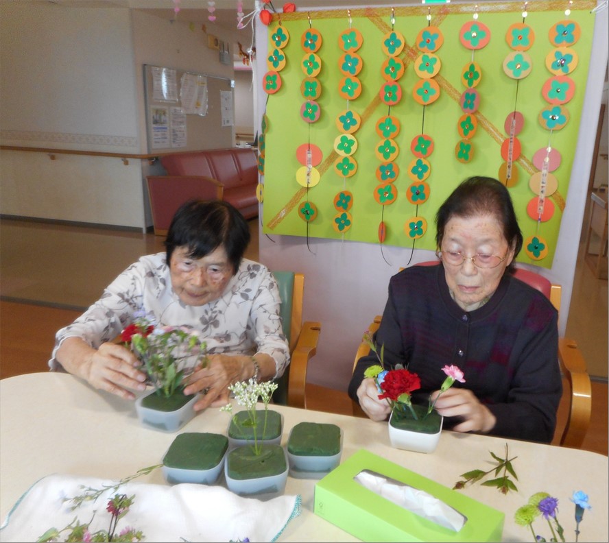 こちらの写真は、先日フラワーアレンジメントレクリエーションの模様。