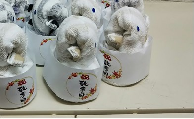 また、恒例のプレゼントは、今治製の「フェイスタオル」をアヒル型に折り、のし紙を付けてお贈りしました。