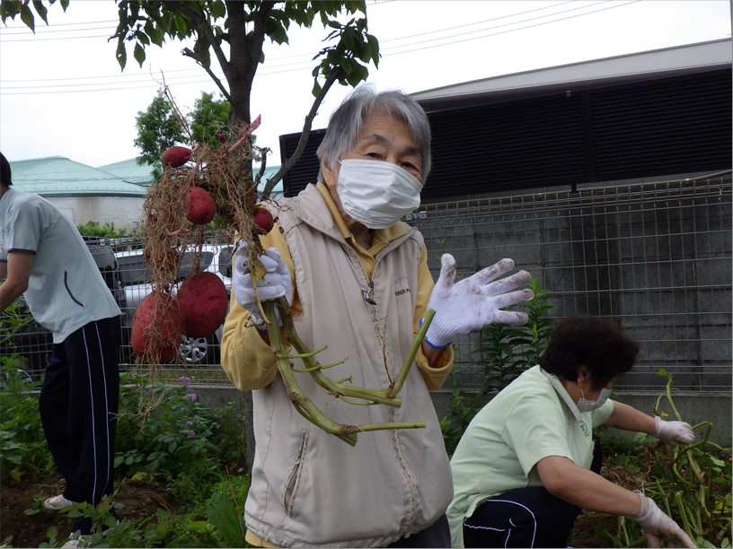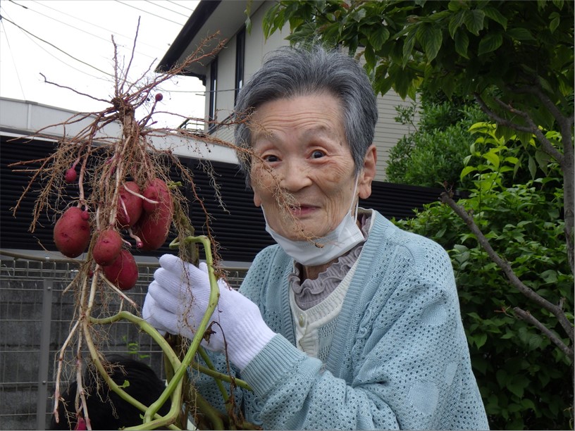 ご入居の皆様は、土と触れ合う機会をいつも楽しみにしておられますが、今回は立派に育ったお芋(十勝こがね・レッドムーン)の収穫に精を出されました!