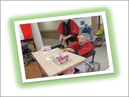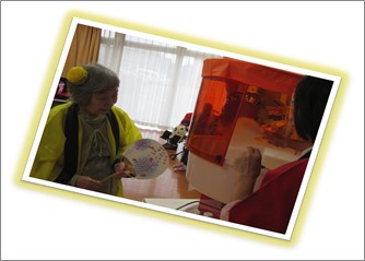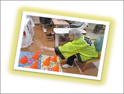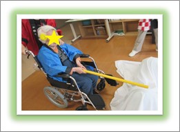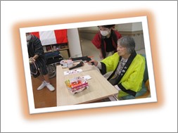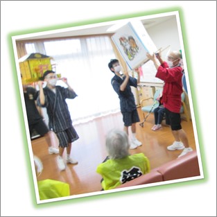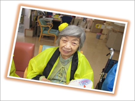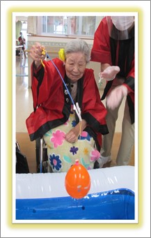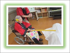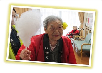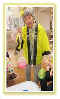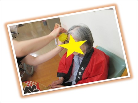 久しぶりの大勢の方達との交流です。ご入居者様には髪の毛に花飾りを付けて頂き、祭りらしいオシャレをして頂きました。