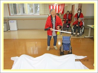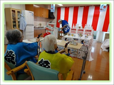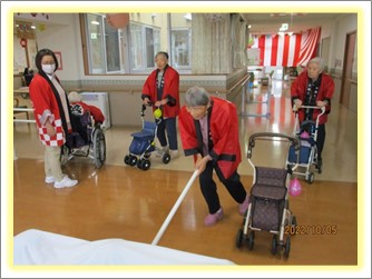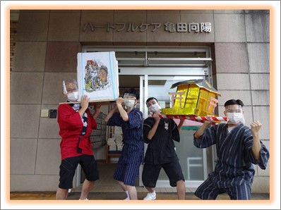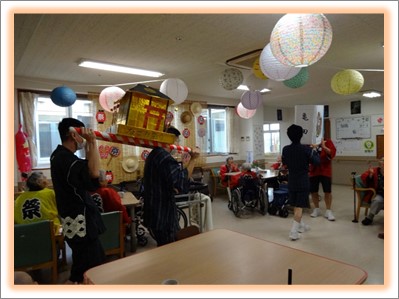 昨年同様、神輿と御神灯を職員が担ぎ、各フロアを練り歩きました。『賑やかでいいわね!』とご入居者様も笑顔!