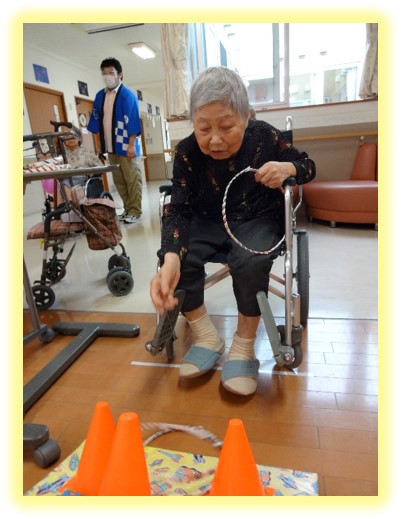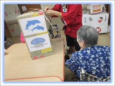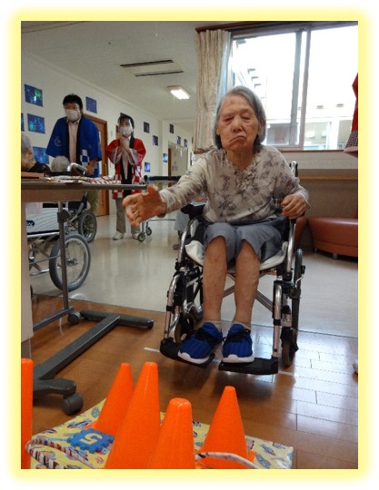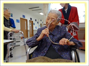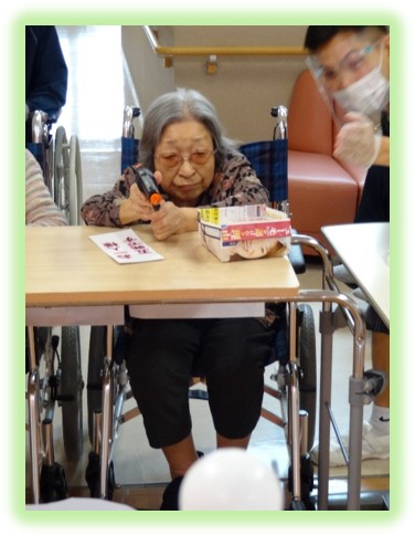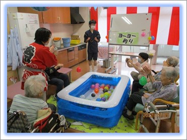 水ヨーヨー釣りでは竿を持ってゴムの輪に引っ掛けて釣ろうと、四苦八苦!やっとで釣り上げると、『こんな大きいの釣れたよ!』と他のご入居者様に自慢しておりました。