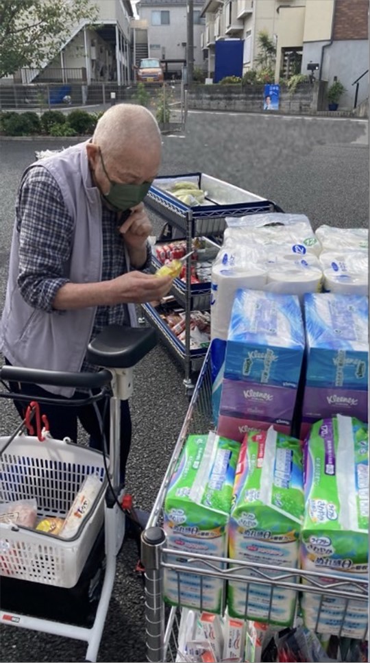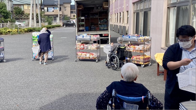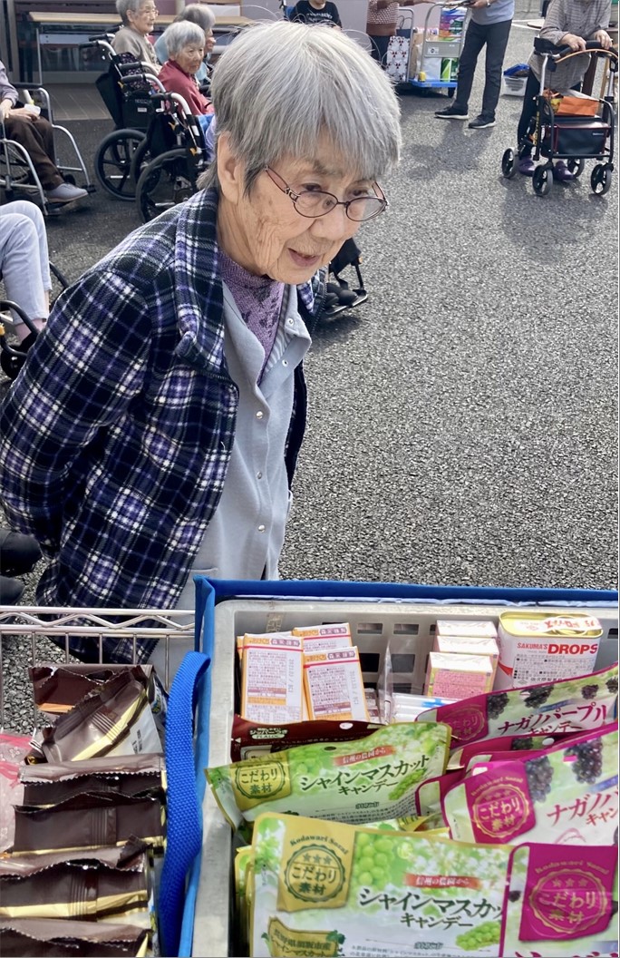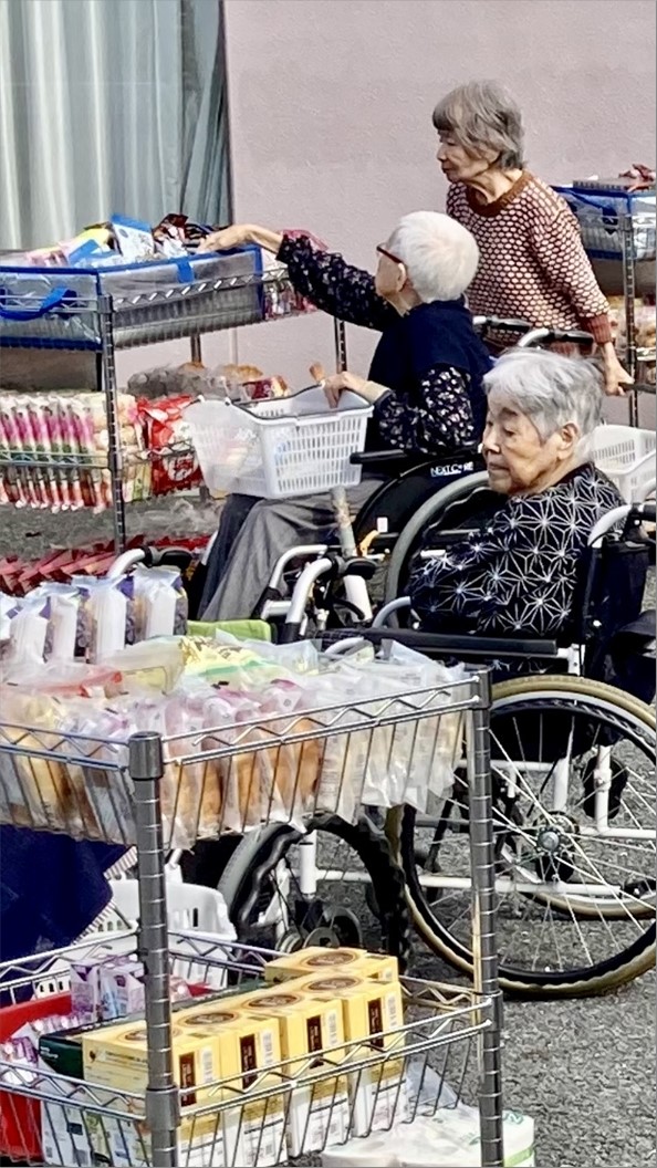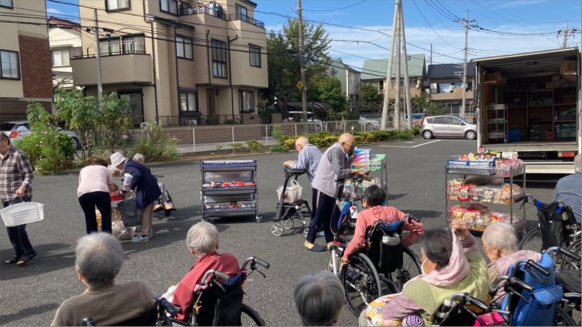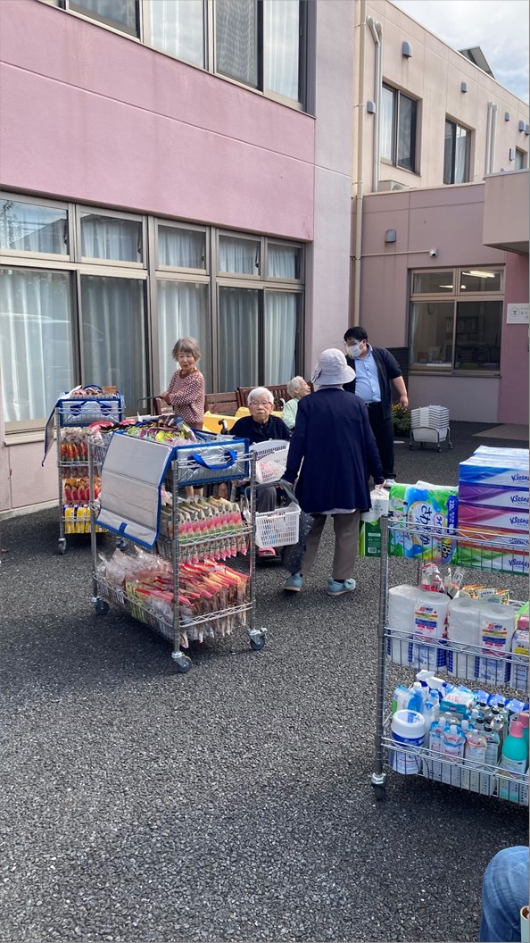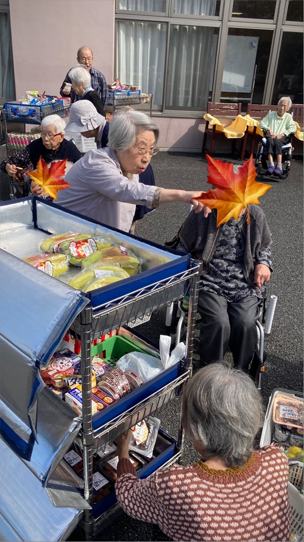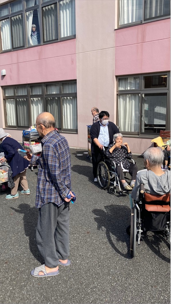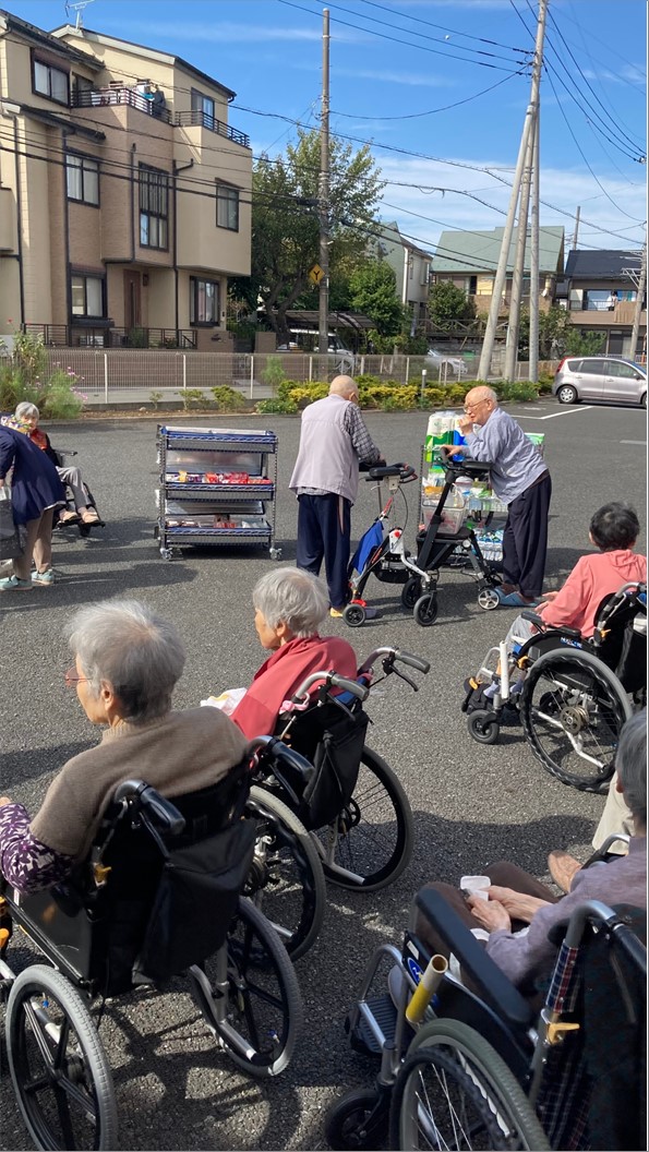 本日の移動販売は、晴天で秋風が暖かいので🌞外で青空販売にしましたぁ~✌ みんなで外の空気を吸いながら暖かい日差しに包まれて、気持ちよさそうです😊