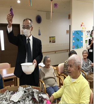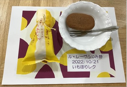 一通りレクリエーションが終わりました後は、お楽しみのおやつです。本日は芋掘りレクにちなんで、お芋で有名な川越のお菓子をご提供させて頂きました。