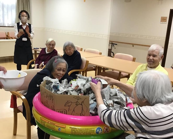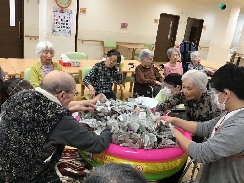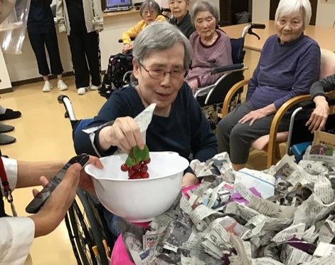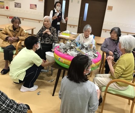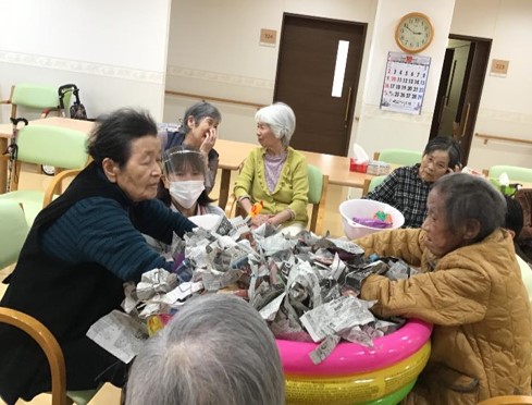 どんなレクリエーションかというと、ビニールプールの中にちぎった新聞紙を敷き詰め、その中に創作した数種類のお芋や、秋の味覚にちなんだ食材などを埋め、『お芋』を手探りで掘り当てて頂くゲームとなります。