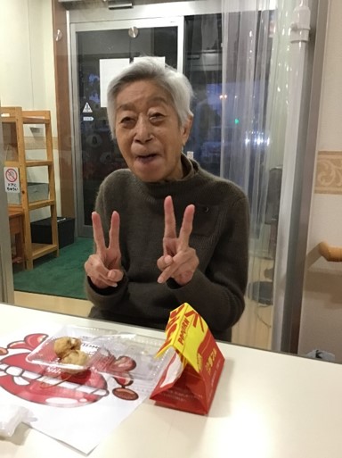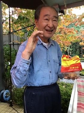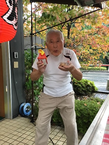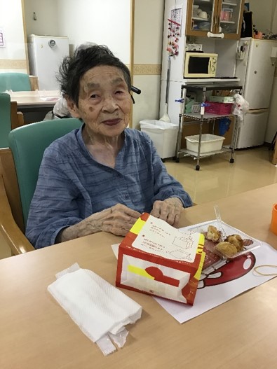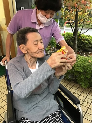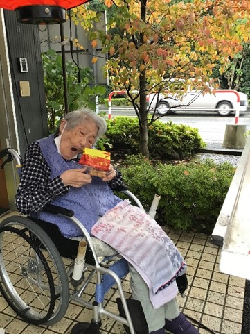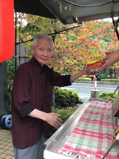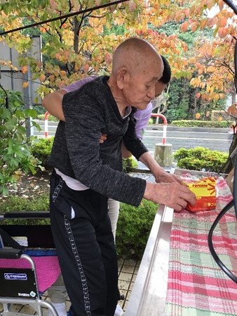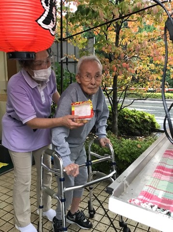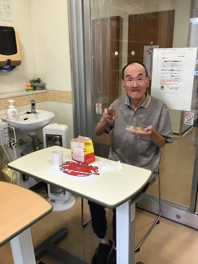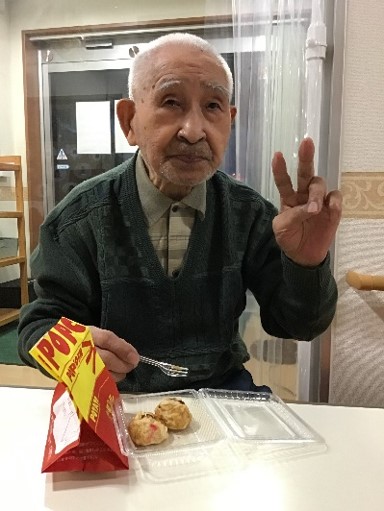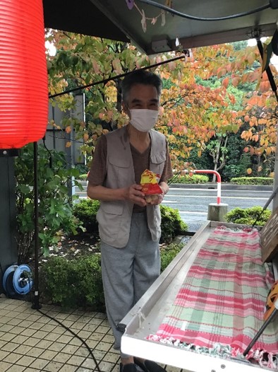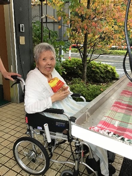 ご入居者さまを順番にたこ”焼き販売カー”誘導し、玄関前で焼いてるところを見学していただきました。