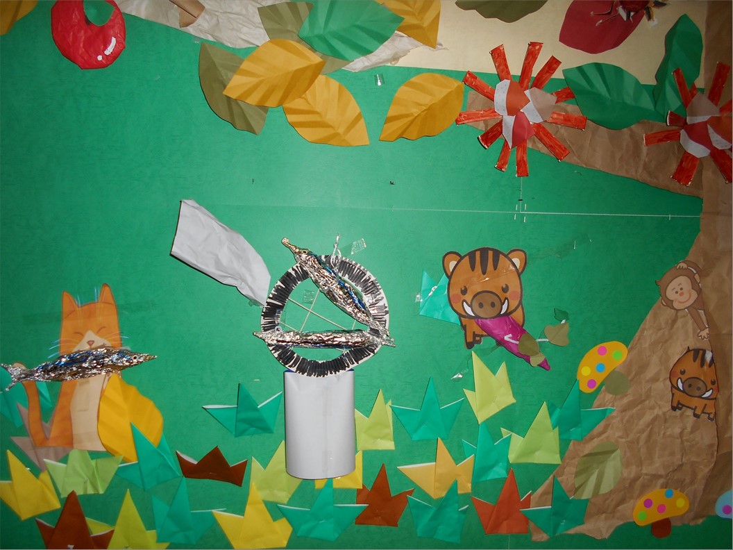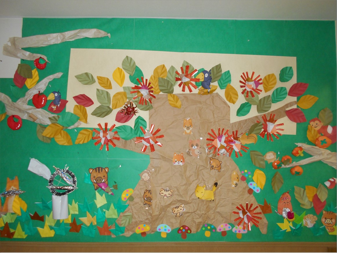 レクレーションの時間に、ご利用者様にご協力をお願いし、真っ赤なリンゴ、熟れた柿、イガに包まれた栗、本物そっくりのサンマを作っていただき、ご利用者様と職員が1枚の絵の様に仕上げました。