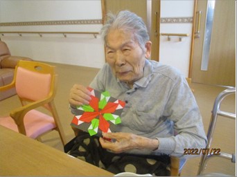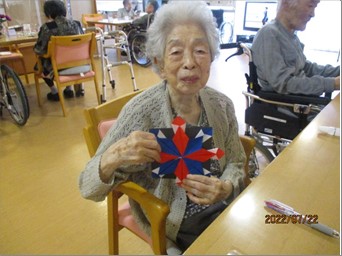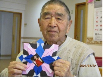 花火の貼り絵をしながら「昔は花火を見に出掛けたな」「花火の音が、お腹に響いたよ」「花火を見ると夏が来たと思った」「いつ見ても花火は楽しいな」とお話しながら折り紙を折って頂きました。