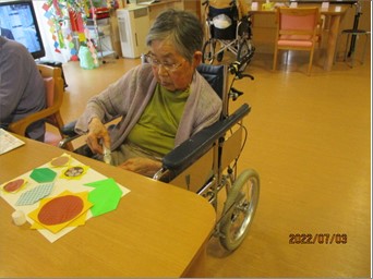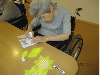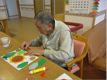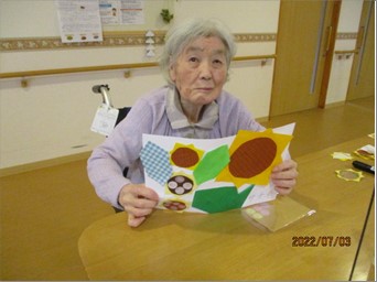 ひまわりの貼り絵は「夏の花と言うとやっぱりひまわりだね」「みんなと違った作品にするよ」「黄色いお花紙を台紙に貼るのは簡単そうだったけど工夫が必要だった」貼り絵で夏気分を味わって頂きました。