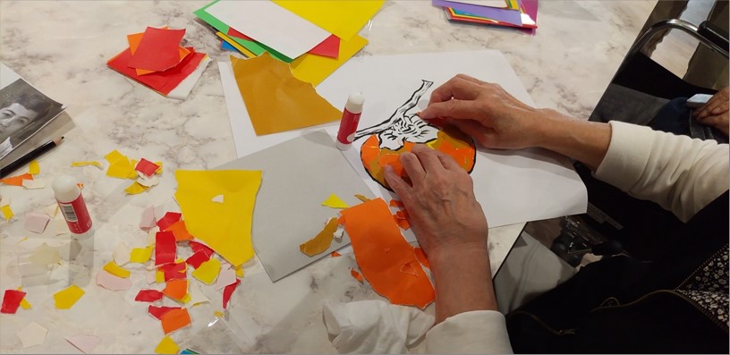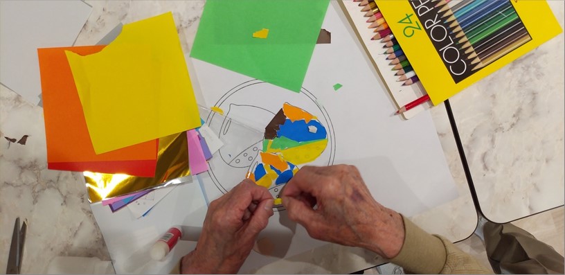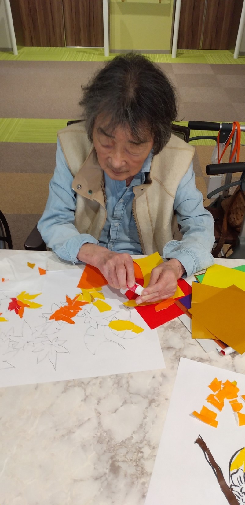 『ローベル上井草』では、秋といえば芸術の秋!秋が旬の食材や紅葉をモチーフに、ちぎり絵をおこないました。