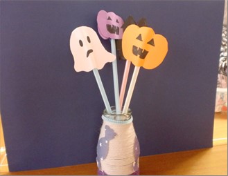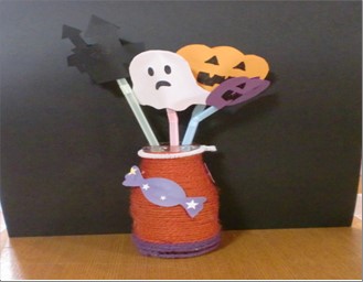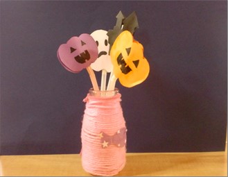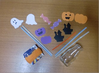 まずは、空き瓶を使った小物製作です♪ビンの周りに毛糸を巻き付け、中にハロウィンの物を入れると完成です!