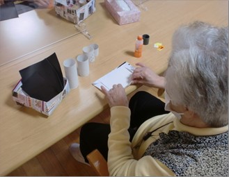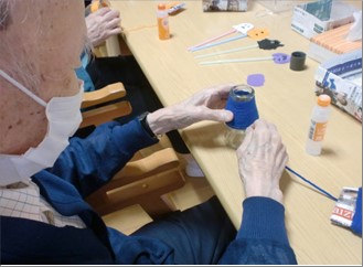 今回の製作では、板状・筒形の台紙に貼りつける作業が多くあり、利用者様の巧緻動作が大事になる物でした。