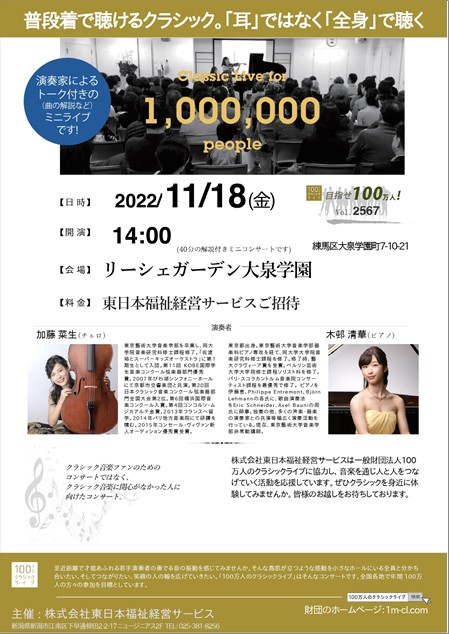 『100万人のクラシックライブ』とは、音楽を通じてコミュニティの活性化を目指す「一般財団法人100万人のクラシックライブ」の活動に賛同し開催しているミニコンサートです。