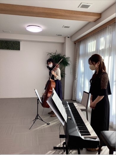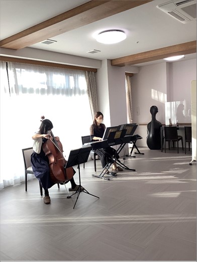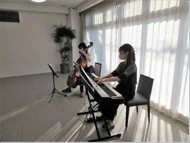 ピアノとチェロのアンサンブル演奏、ソロ演奏で、楽器の綺麗な音色が室内に響き渡ります♫