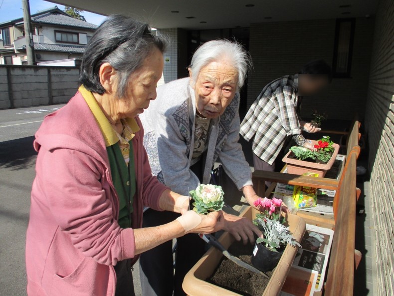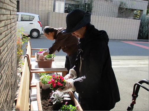 ご入居者様にもお手伝いをお願いし、それぞれ自由に植え付けて頂きました。