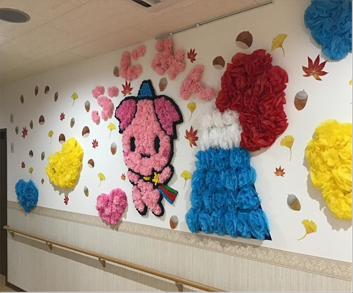 『ル・レーヴふじみ野』1階エレベーターをおり大浴場まで続く廊下には、職員による「素敵な壁画」が月ごとに創作され、ご入居者様の楽しみのひとつとなっております。