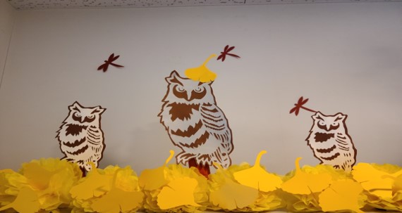 秋の訪れを楽しんでいるかのように、キツネ・フクロウ、天井を見上げると、リス・モモンガが皆様をお出迎え!