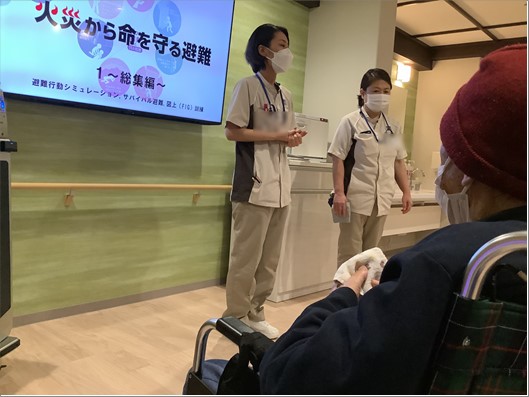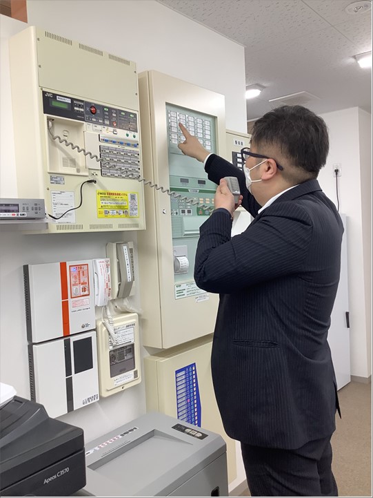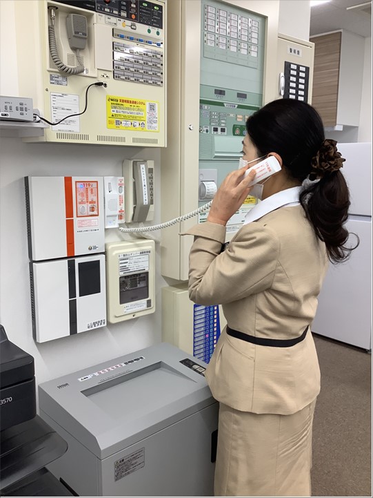事務所では、館内放送の避難指示と119番通報のシュミレーションも実施しています!