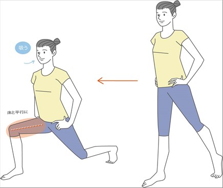 背筋を伸ばして、足を前後に大きく開いて、膝を少し曲げる。