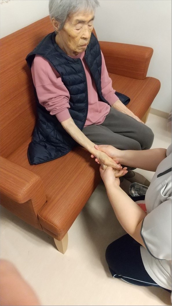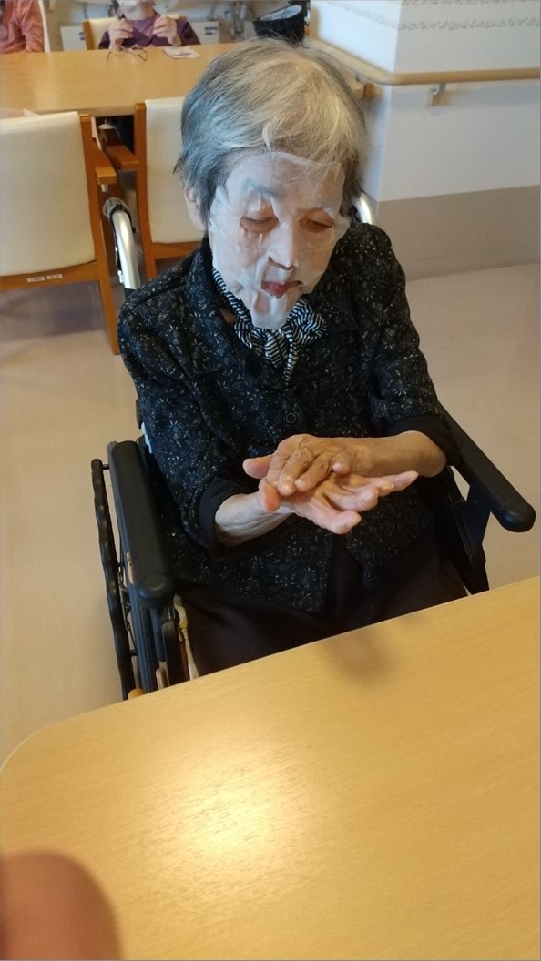 15分アッと言う間!!気持ちよさそうは表情を見せてくださるご入居者様や、残った美容液でハンドマッサージをしてもらうご入居者様も。