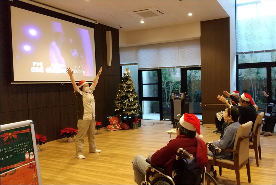 「ジングルベル」や「ホワイトクリスマス」の曲にスタッフの掛け声を合わせて体をゆっくり大きく全員一緒に動かしてリラックスしていただきまた、体操の後にはクリスマスの歌を大きな声で全員で歌い楽しんでいただきました。