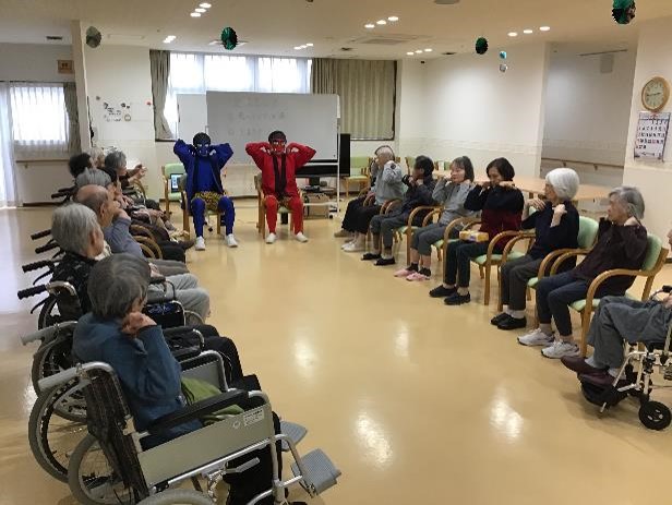 「鬼のパンツ体操」を元気よく実施して頂きました。皆さま、笑顔で座ったままでも行える体操を鬼と音楽と一緒に実施しました。