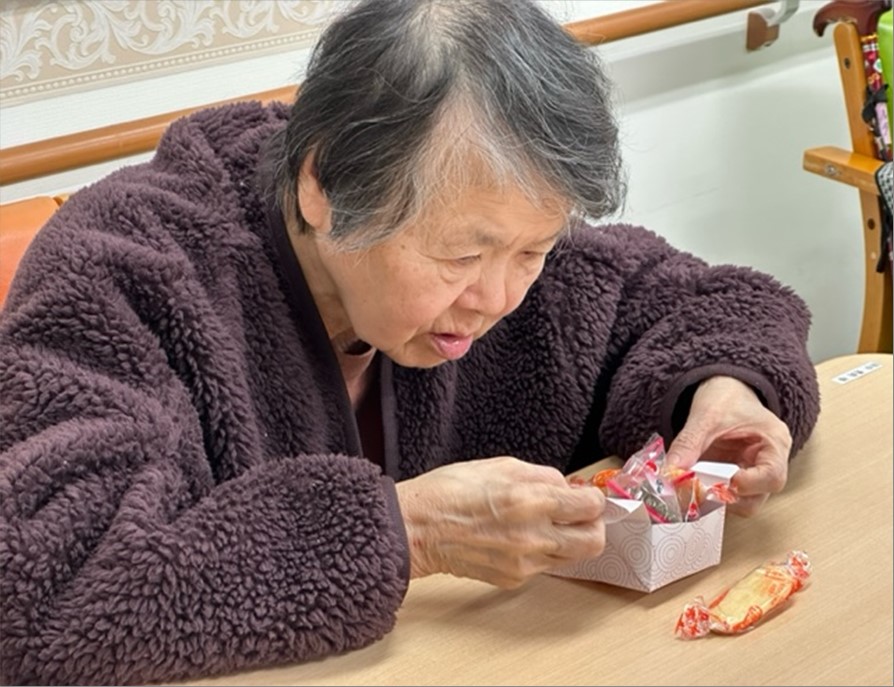 器に使用した紙箱は、レクリエーションで折っていただいた物です。持ち帰り小物入れにされる方もいらっしゃいましたよ。