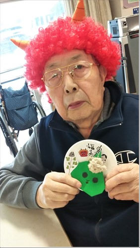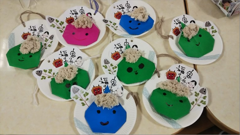 折り紙や紙皿を使ったかわいい鬼のタペストリー作りも行いました。