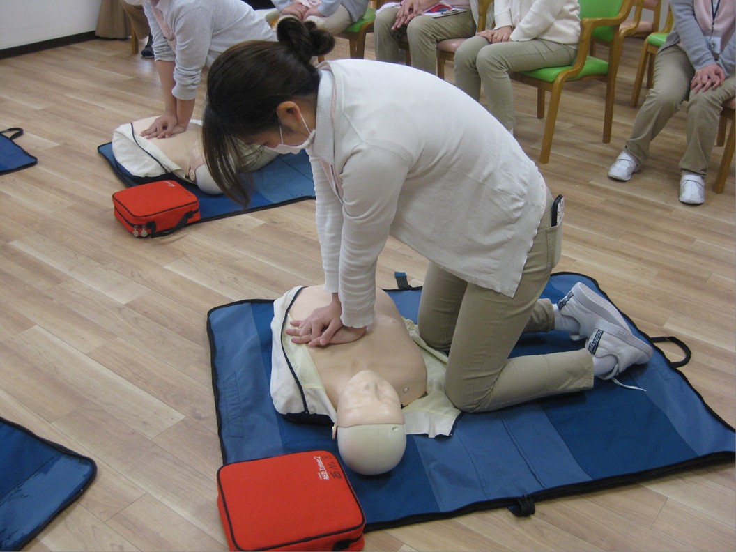 まずはDVDを観て、救命リレー、心肺蘇生法、心臓マッサージを行うタイミング等を学びました。
