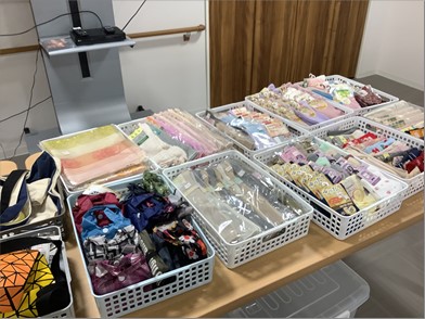 いつものように1階ホールで実施、ずらりと女性もの、男性ものの衣類や肌着類、小物、お菓子が並びました。