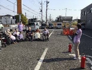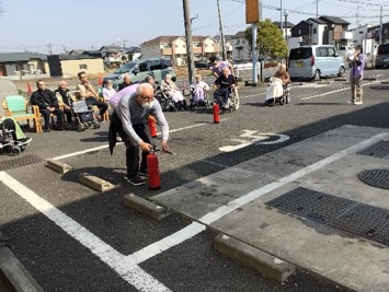 避難訓練の後は消火訓練になります。毎回全員参加でお願いしているので、今回も全員外へ移動です。