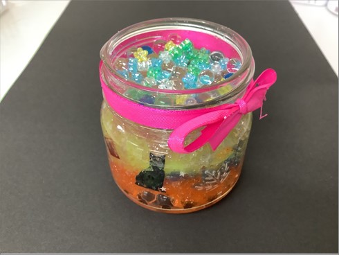 ガラス瓶のなかにキラキラした飾りの小物☆彡を入れながら、アロマオイルを垂らして着色した保冷剤をゆっくりと流し込んでオリジナルのアロマポットができあがりました。