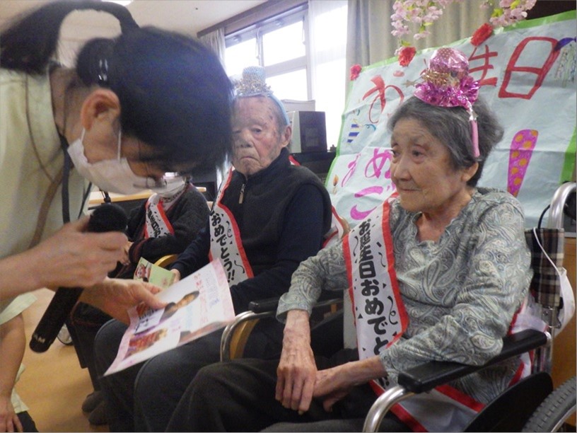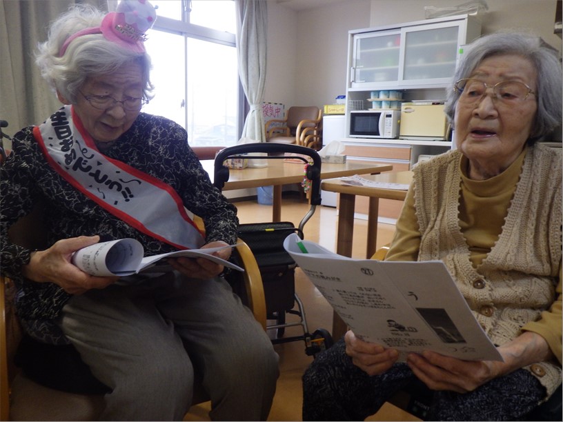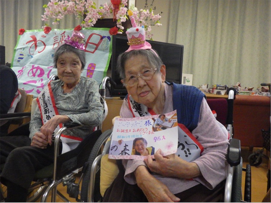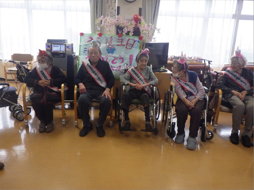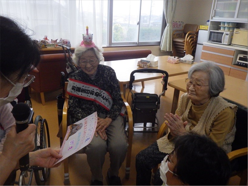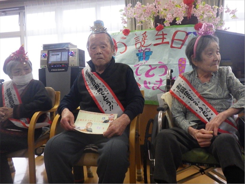 たすき掛けと手作りのキャップを被っていただき、皆様から「おめでとう!」の祝福をうけて私が主役の誕生月の方々は、写真撮影やマイクを握ってのカラオケを楽しまれました。