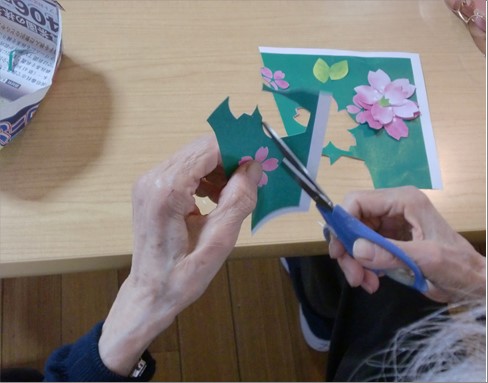 中の桜は、職員と利用者様で協力し、約1か月かけて制作した2mを超える壁面装飾になります!