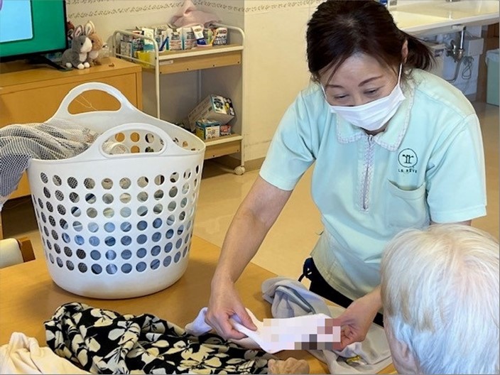この場面は、職員と入居者様が一緒に洗濯物をたたんでくださっている場面!!