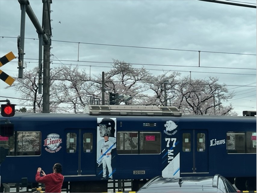 稲荷山公園駅ではちょうど西武ライオンズのラッピング電車が走っていました!