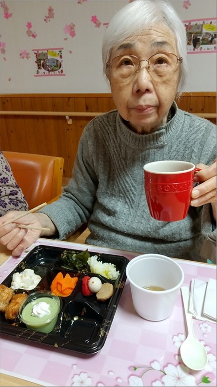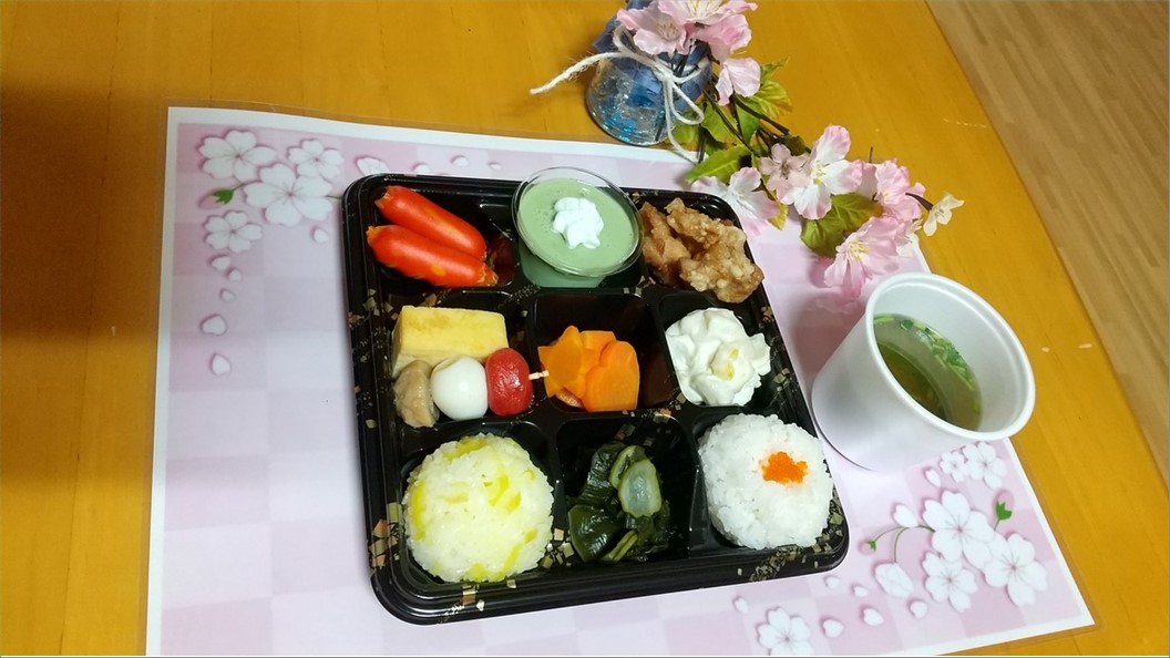 桜の木の下でお弁当を食べるはずでしたが、フロアで召し上がって頂きました。