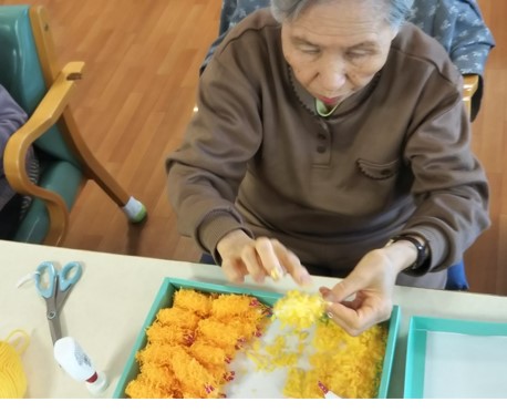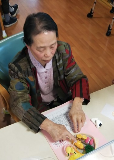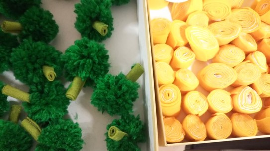 紙粘土以外の素材、毛糸とフエルトでブロッコリー、フエルトとお花紙で卵焼きなど、なるべく抵抗なくご利用者様皆さんが参加できるよう、細かく工程などを分けていきます。