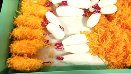まず、紙粘土を使ってひとつひとつおいしいものを作って行きます。ただ丸めるだけではなく、指先を使って太さなどを少しずつ変えていきます。