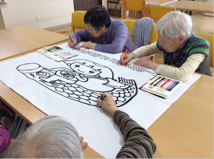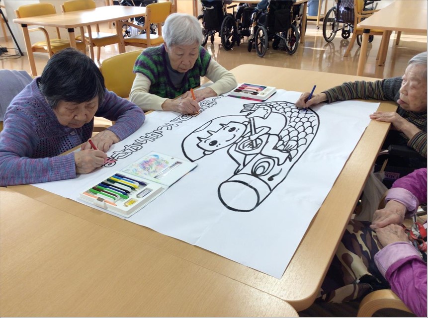 カレンダーの題材につきましてはご入居者様と一緒に検討させて頂きました結果、鯉のぼりに跨った金太郎の絵にしようとなりました。