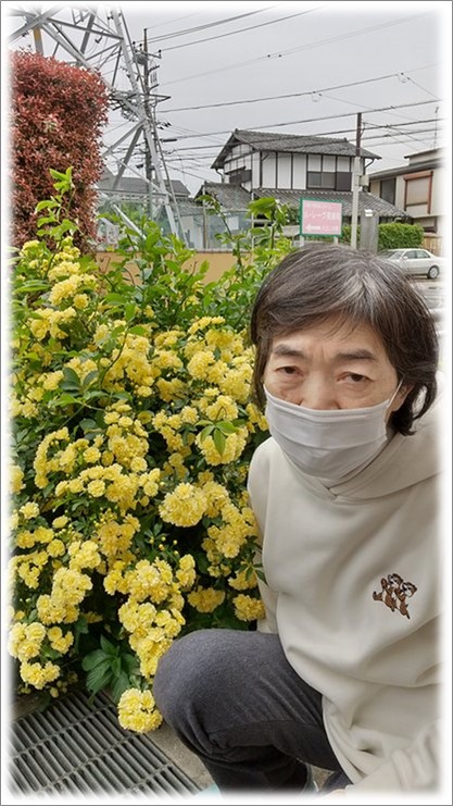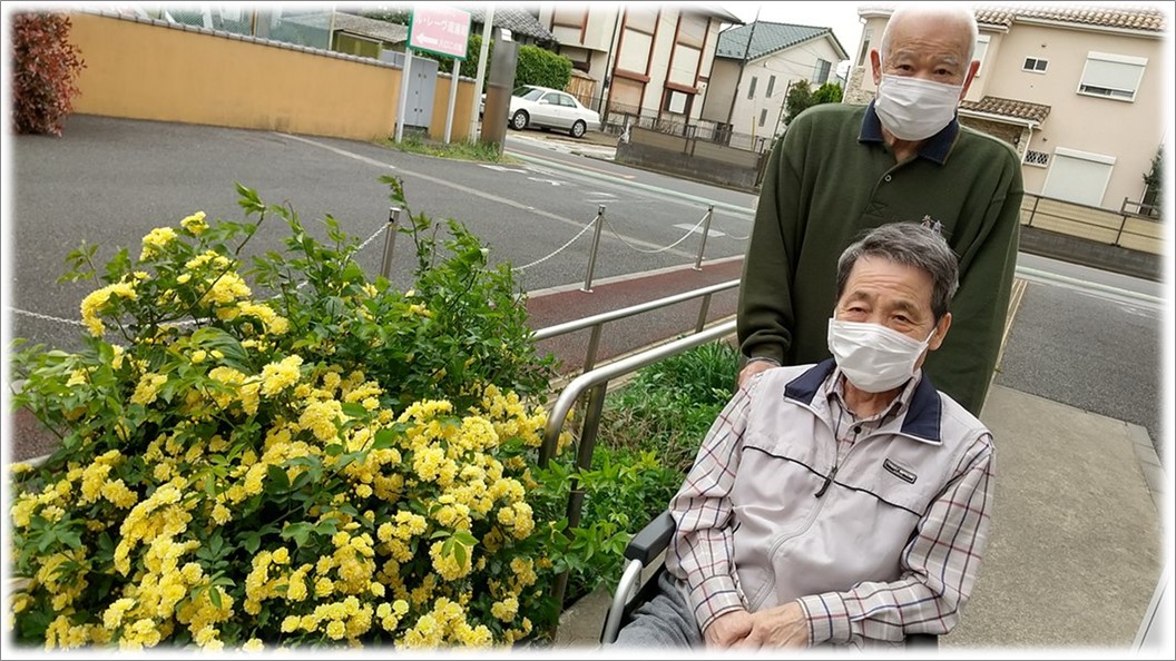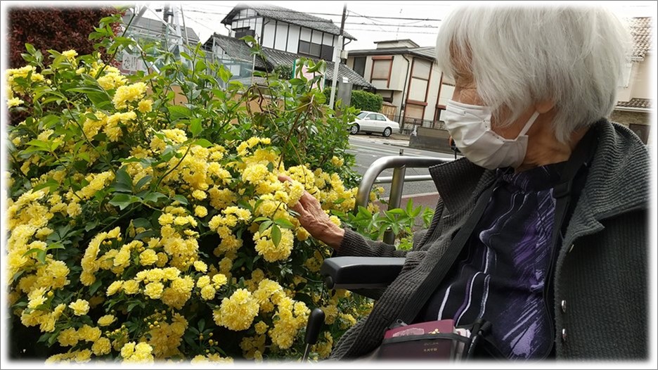 外に出た瞬間「わあ~気持ちいい。」「風があっても、暖かい。」「黄色い花は【モッコウバラ】です。今、満開ですよ。」と、職員。
