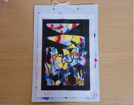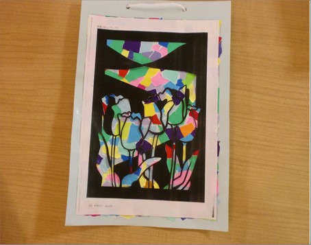 今回の製作イベントは、ちぎり絵です♪ 台紙に様々な色の折り紙を貼り、最後にチューリップの絵を重ねて完成です!