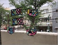 桜の花が散り、2階の食堂からこんもりと緑豊かに葉が輝いているのが見える窓に作品をはりました。