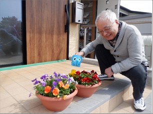 プランターに寄せ植えしたお花に、ご入居者様がお水をあげてくださいました。
