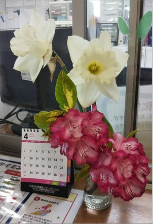 職員の自宅の庭に「水仙」が咲いたそうで一輪挿しに生けました。「花」があると事務所前のカウンターも一気に華やかになりますね🌺。