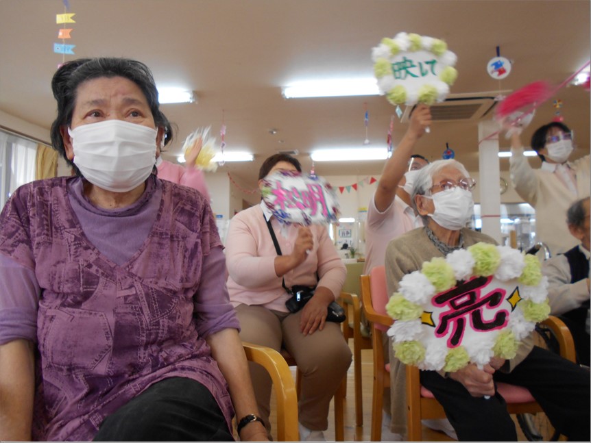 スタッフとご利用者様とでうちわやボンボンを手作り楽しく鑑賞しました!