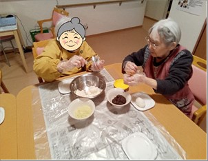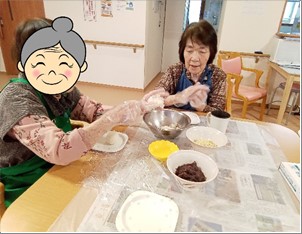 入居者様と一緒に、きなこ味、あんこ味の2種類を作りました。