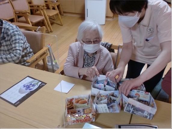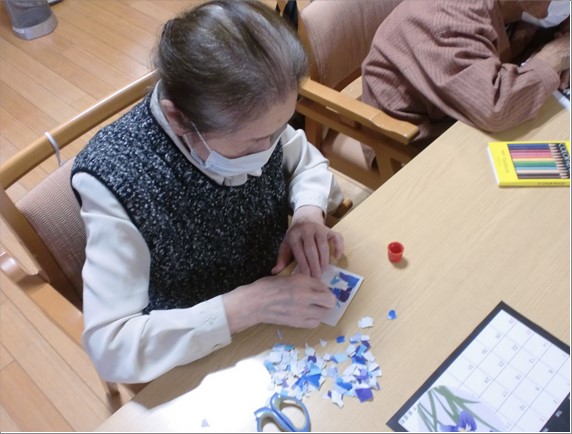 『デイサービスセンター ル・レーヴ南浦和』では、定番となりつつある貼り絵を使った兜と菖蒲の花を飾ったカレンダーになります!