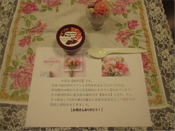 母の日の由来をお知らせして、感謝の気持ちを込めて、ちょっと豪華なアイスクリームを召し上がっていただきました。